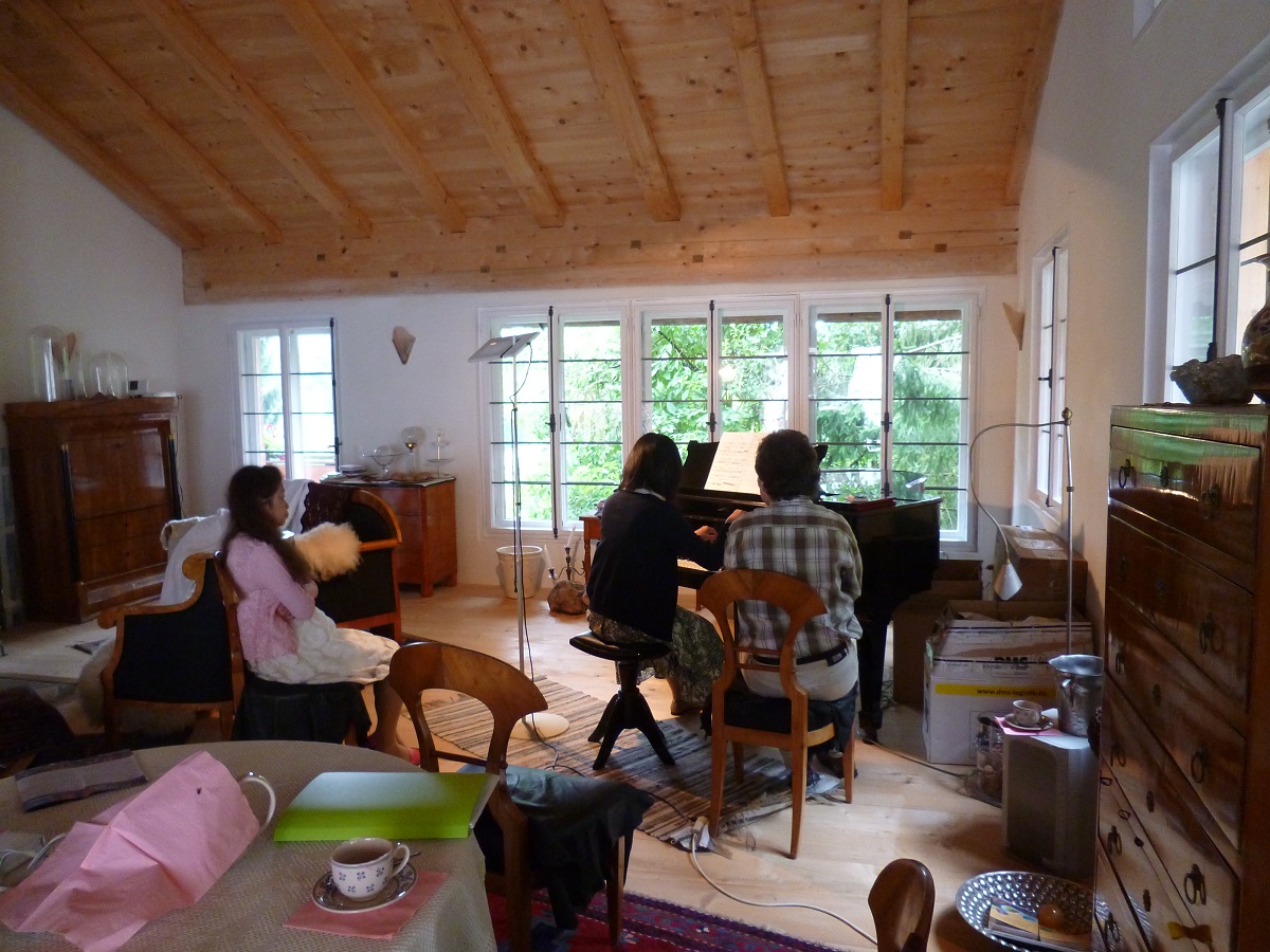 出発前の大きな疑問に、こんな村にまともなグランドピアノあるんかいな?って感じでしたが、ここの村に4台グランドピアノがあり、一つはさっきお仕事でマティアスが弾いていた白いグランドピアノ。でもここのお部屋はハープのクラスが使用するのでこのピアノは使えない。いったいレッスンはどこでするのかと思ったら、獣医さんのお宅にスタインウェイがあるらしくマティアスが、「今からそのお宅にピアノ見に行きましょう」と、まず偵察に行き、そこで会場主さんに了解を得て、Jahnさん宅でレッスンさせてもらうことに決定。