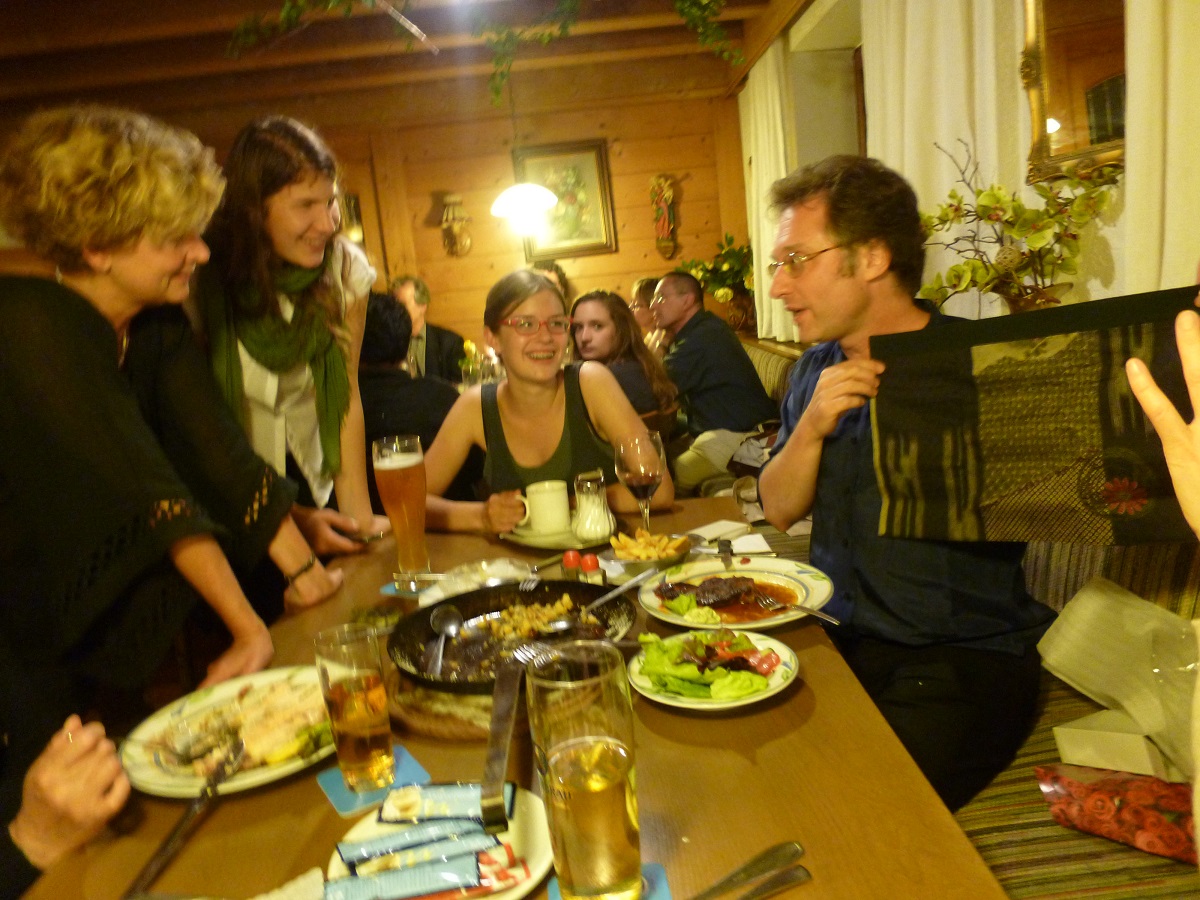 今晩ほとんどのハープの生徒が打ち上げの後、帰って行かれた。仲良くなったソフィーとミリアムともお別れ。ハープの生徒はホテルのお部屋で練習していたのですが、その楽器はいったいどうしてるのか疑問だったのですが、車でマイハープを持参なのだそう。なので若い彼女らはご両親がお迎えに来られてました。生徒にもらったお土産を自慢げに披露。手前がハープのシェレンベルガー先生で真ん中がソフィー、右がミリアム(17歳)